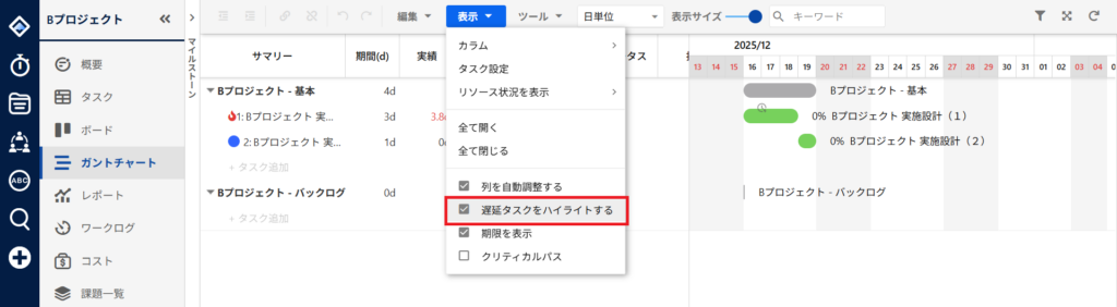 遅延しているタスクがガントチャート上でハイライト表示されます。