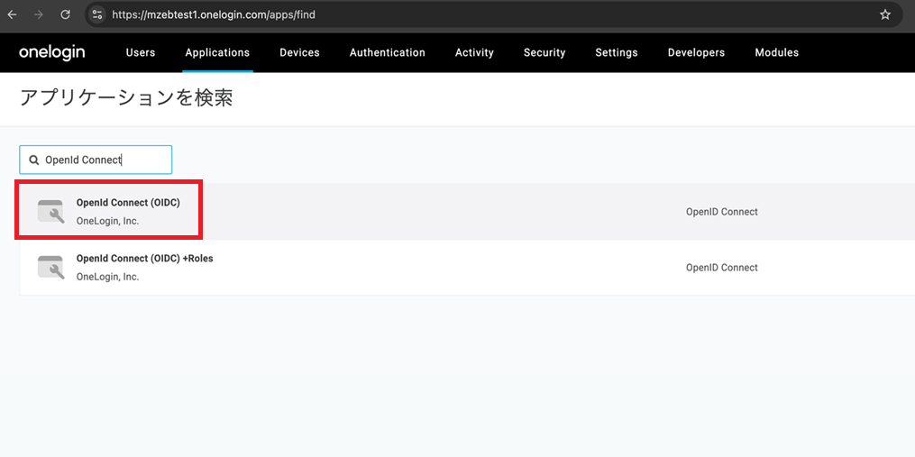 Oneloginにログインし、「Applications」タブを表示してください。次に「OpenId Connect (OIDC)」を追加してください。