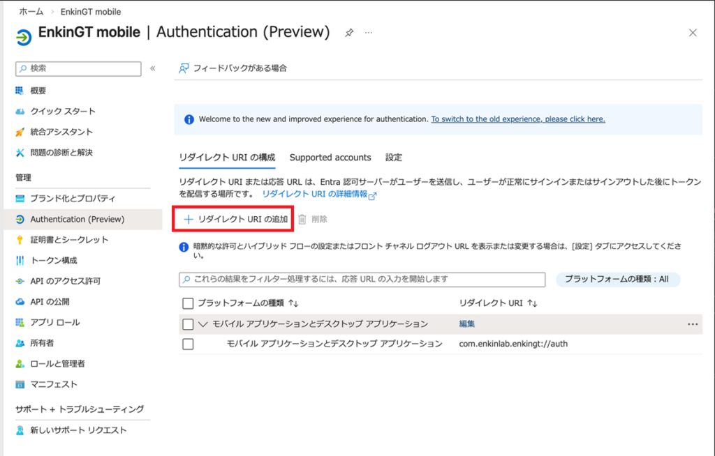 リダイレクトURIを追加するプラットフォームを選択します。「iOSまたはmacOS」、「Android」のそれぞれを順番に選択し、URIを登録します。