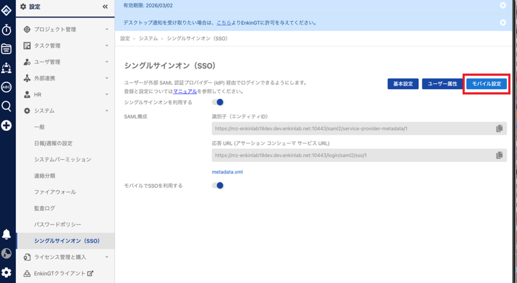 EnkinGT側の設定を行います。管理者ユーザーでEnkinGTにログインし、左サイドバーの「歯車アイコン」→「システム」→「シングルサインオン」を表示してください。次に、画面右上に表示されている「モバイル設定」ボタンを押下してください。