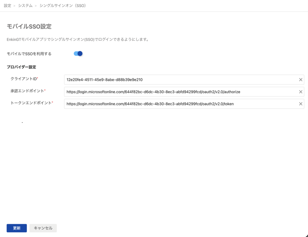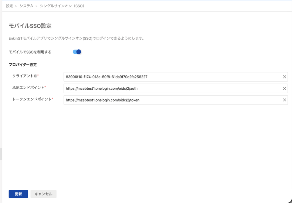 モバイル向けのSSO設定を行います。さきほど”Step6“でコピーした値を元に入力し、「更新」ボタンを押してください。