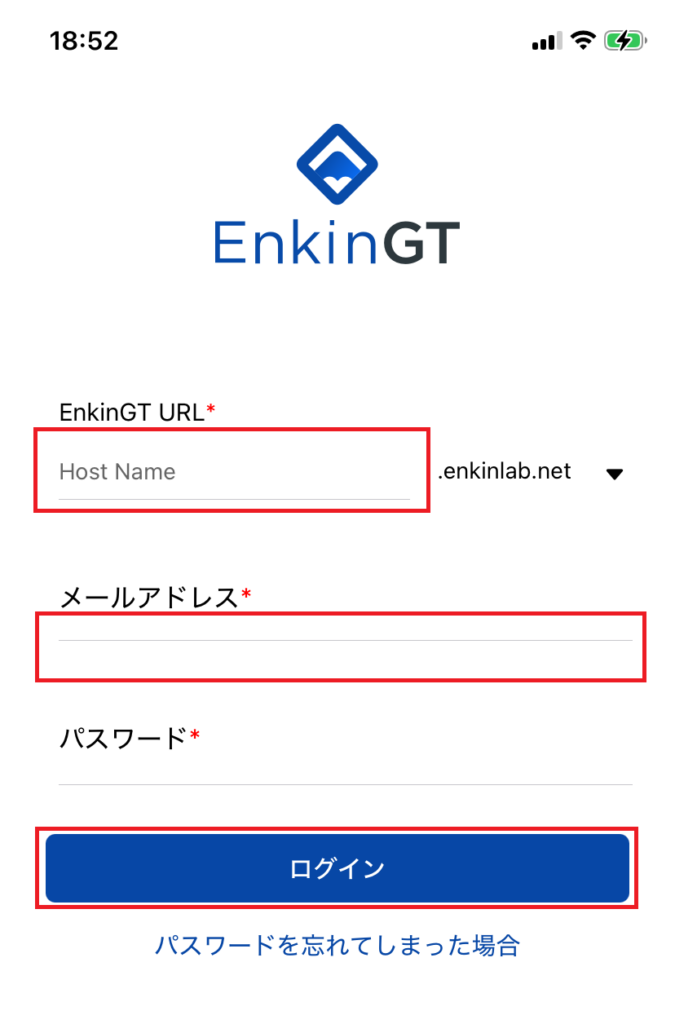 EnkinGTモバイルアプリを起動し、URL用の”Host name”と、ログインユーザの”メールアドレス”を入力してください。