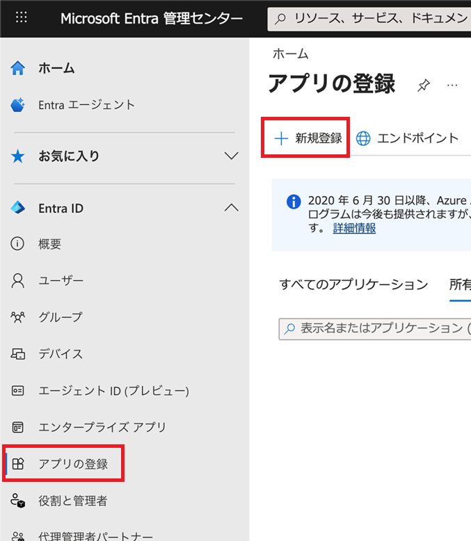 Microsoft EntraID管理センターを表示し、「アプリの登録」から「新規登録」をクリックしてください。