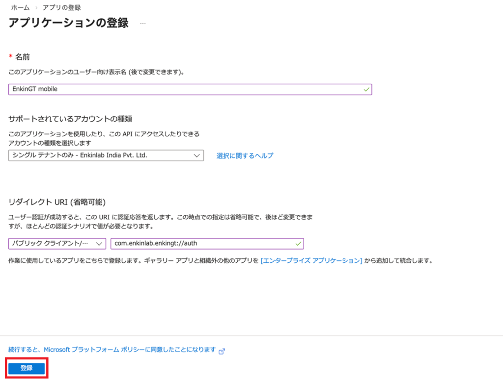 アプリの登録画面で、以下の設定値を入力し、「登録」ボタンをクリックしてください。