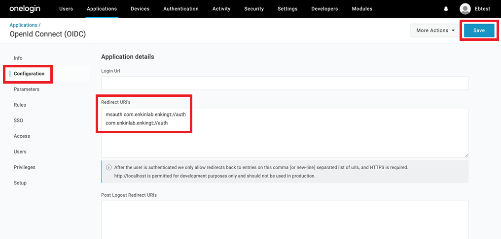 以上でOnelogin側の設定は完了です。次に設定した値をEnkinGT側に反映します。